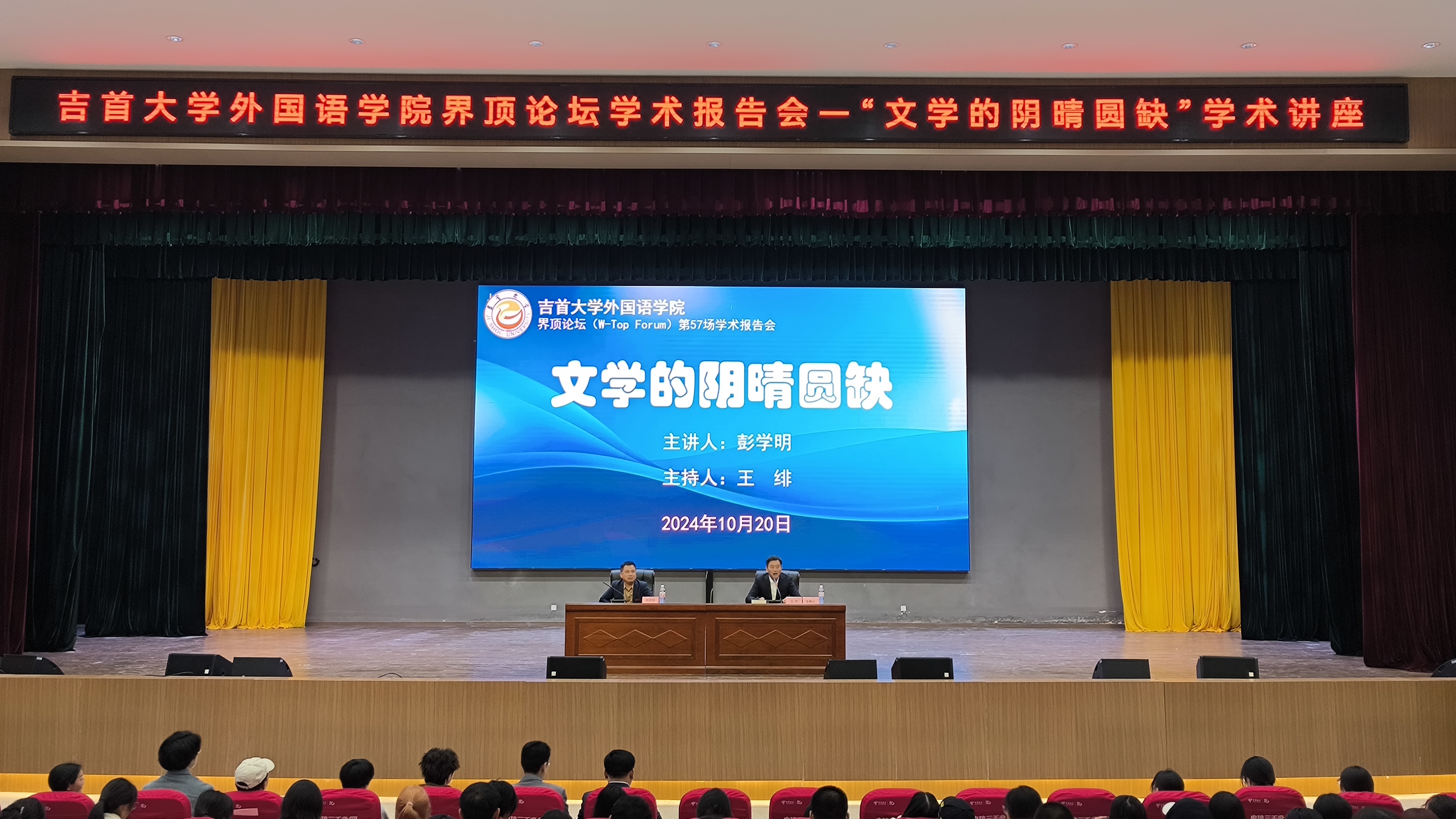 本网讯(修伟)10月20日,公司84级英语专业员工,著名湘籍作家彭学明先生莅临张家界校区做客mk体育“界顶论坛”,为校区师生主讲《文学的阴晴圆缺》,报告会由公司党委副书记王绯主持,张家界校区师生800余人出席。