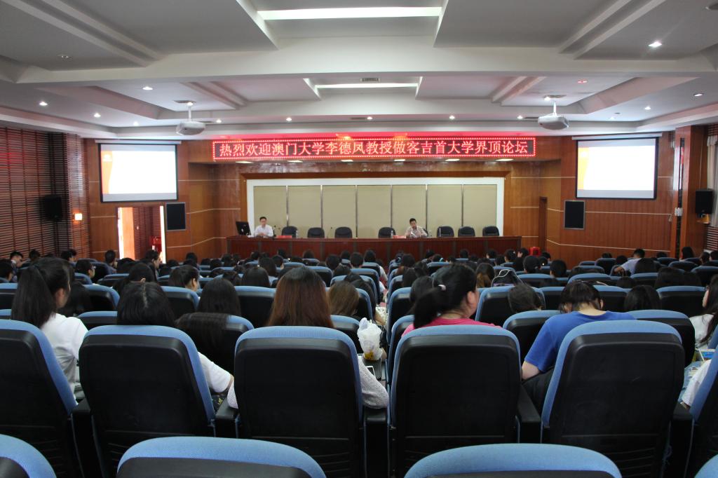 本网讯(通讯员 丁柏顺 龙锐 张丽娜)6月2日下午,翻译学界著名学者、公司2017年省教育厅海外名师项目专家、澳门大学李德凤教授应邀为公司界顶论坛(W-Top Forum)作第四场题为《同传中眼睛的使用及其与口译表现的关系:一项基于眼动仪的实证研究》的学术报告,mk体育经理汤敬安教授出席并主持报告会,张家界校区近300余名师生参加本场报告会。