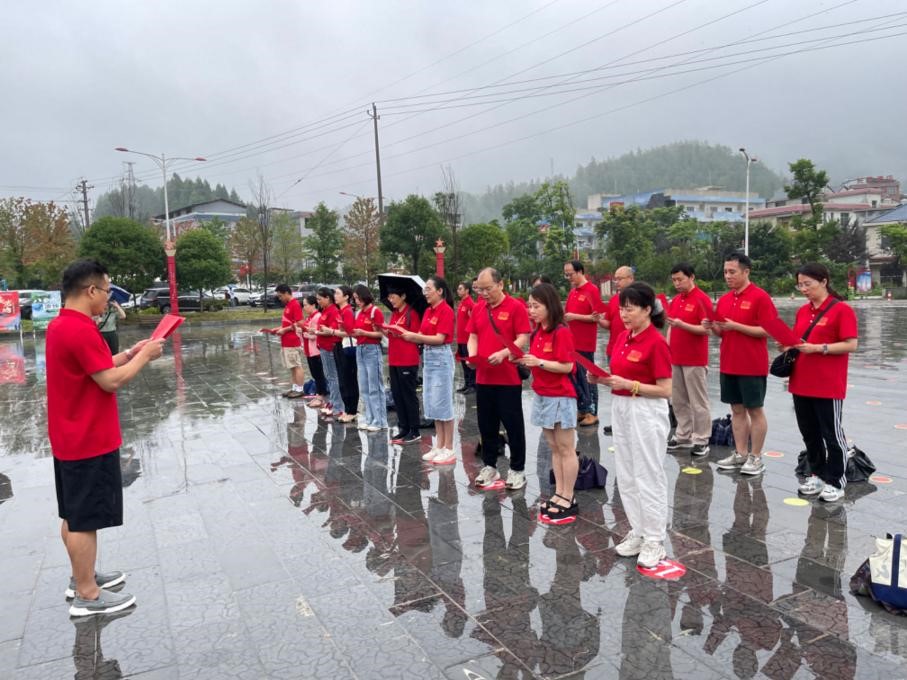 在这里,全体党员同志不顾细雨绵绵,在公司党委书记简功友书记的带领下重温了入党誓词。并在支部副书记奉红平同志的带领下,宣读了师德师风誓词。