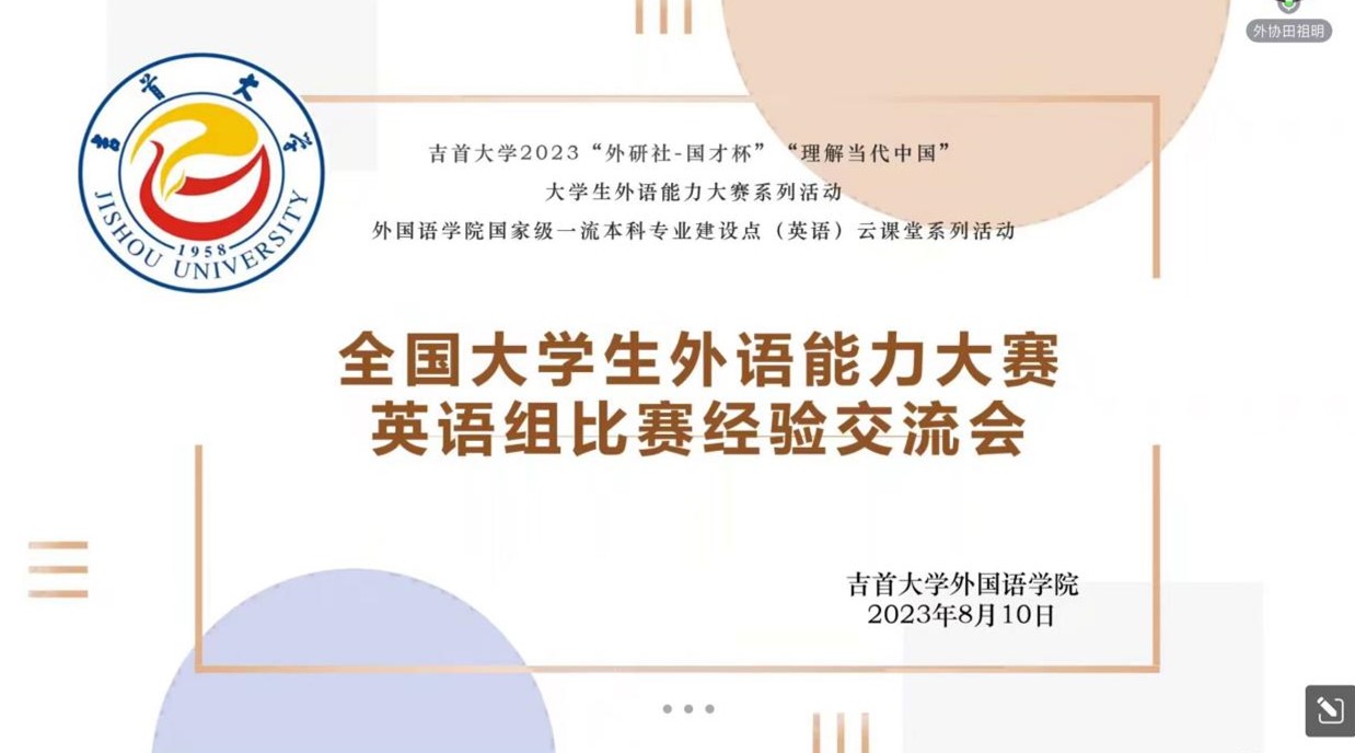 本网讯(通讯员朱芳东、侯璐、修伟)8月10日晚7:00公司“外研社·国才杯”老员工外语能力大赛英语组比赛经验交流会暨2023年“理解当代中国”外语能力大赛动员会在线上如期举行。活动由公司教务处主办,张家界校区教科研学中心协办,mk体育承办,全校报名参加年度比赛的各专业本科生及硕士研究生近100人与会,会议由外语协同创新工作室来自2022级的英语师范生田祖明主持。