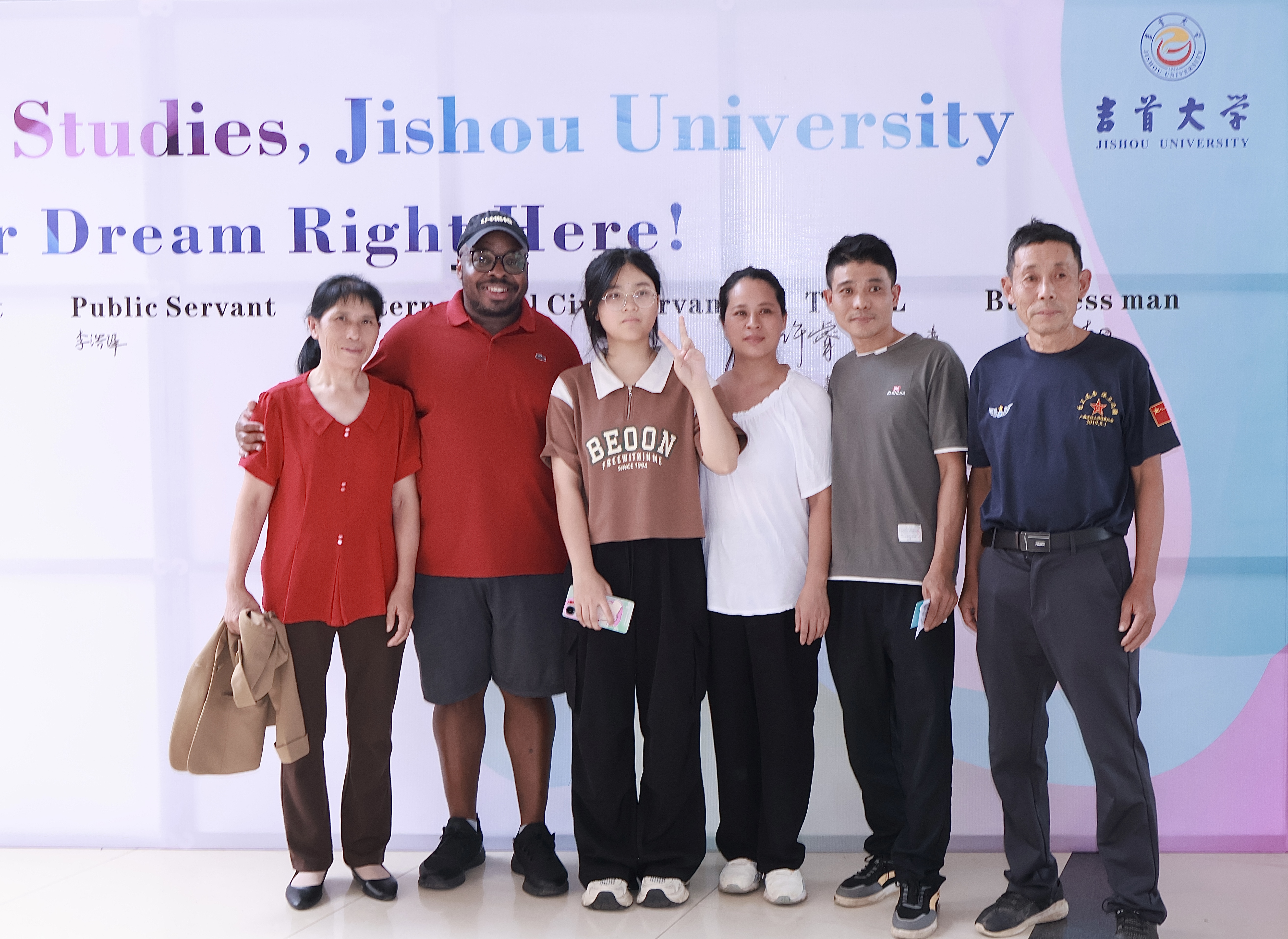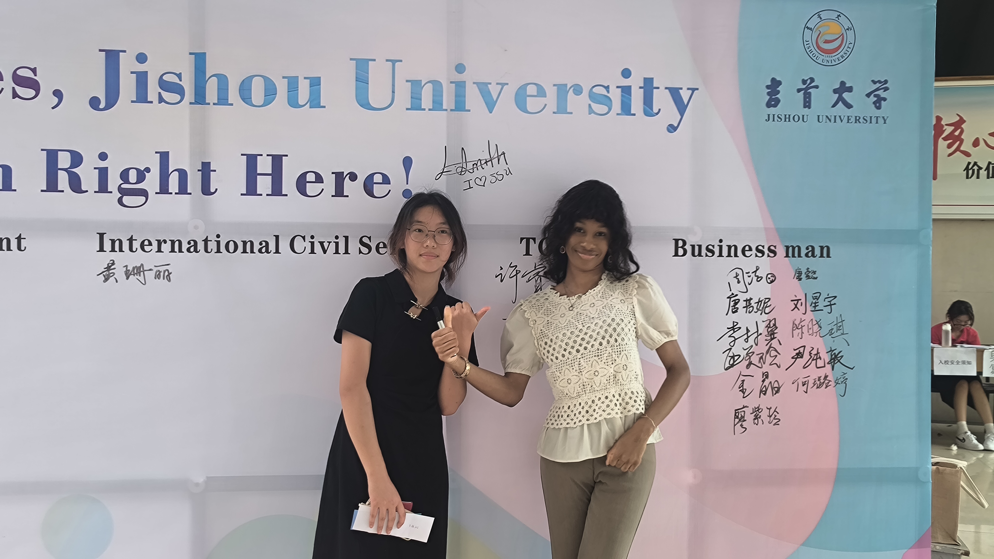 外籍教师Tu-Kwon Thomas,Latonya Smith 轮流全天候在张家界校区迎新现场等候新生,与新生逐一面对面交流。外教与新生寒暄问暖后,询问新生对外语类专业的认识,及今后的职业意向;引导新生在外语教师、口笔译者、外交官、公务员、国际组织职员、中文国际教育教师、企业家等诸多职业中做好选择和规划,在签名墙相应位置郑重签署姓名,并与外教合影留念。