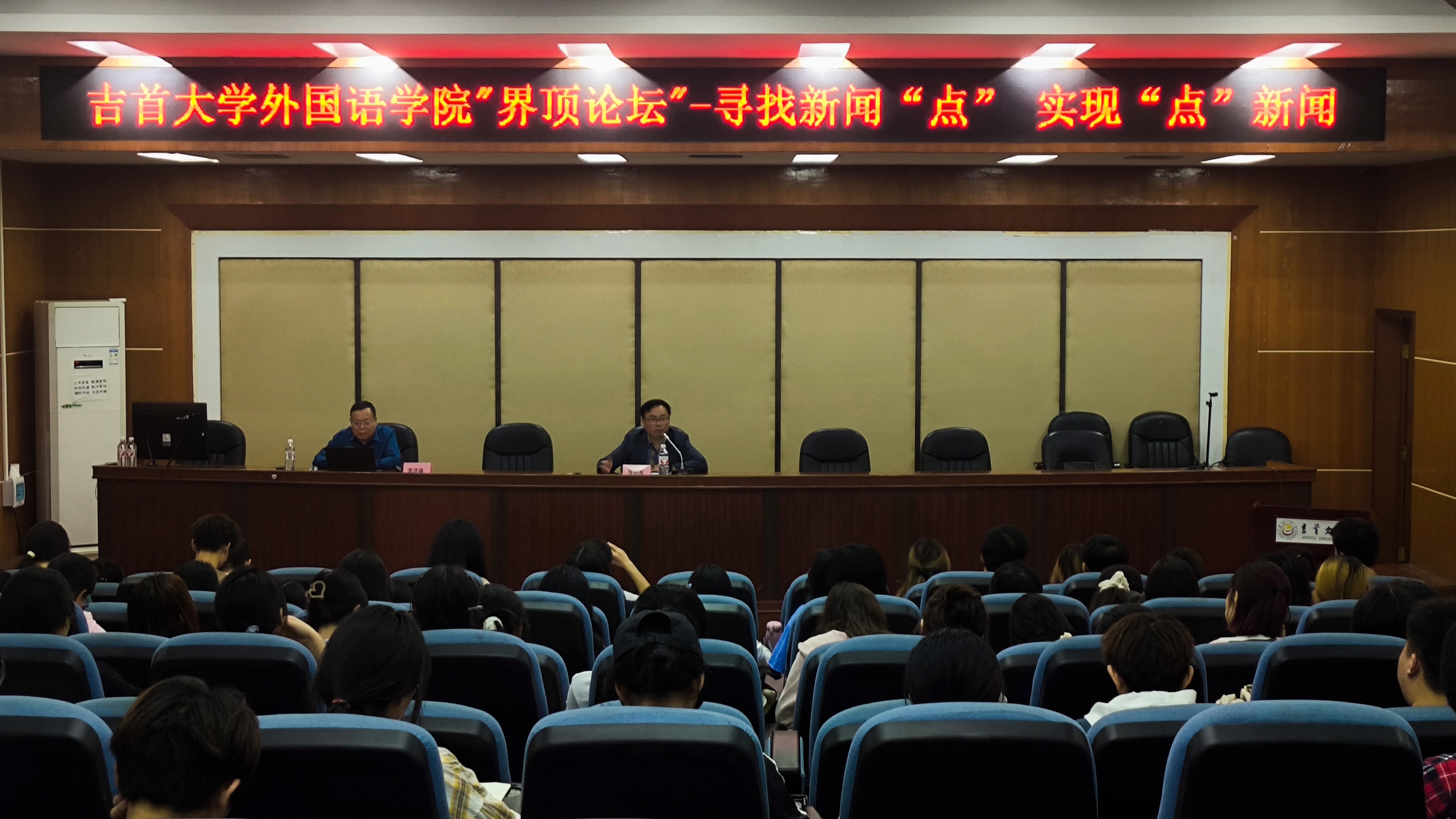 本网讯(修伟 陈慧 李安妮 赵艺)10月9日晚19:00应外国语公司党委邀请,公司党委宣传部常务副部长李洪雄研究员做客“界顶论坛”在张家界校区逸夫教学楼多功能报告厅为校区师生作题为《寻找新闻“点” 实现“点”新闻》新闻写作报告,报告由外国语公司党委书记简功友主持,张家界校区mk体育师生及校区新闻写作爱好者100余人出席。