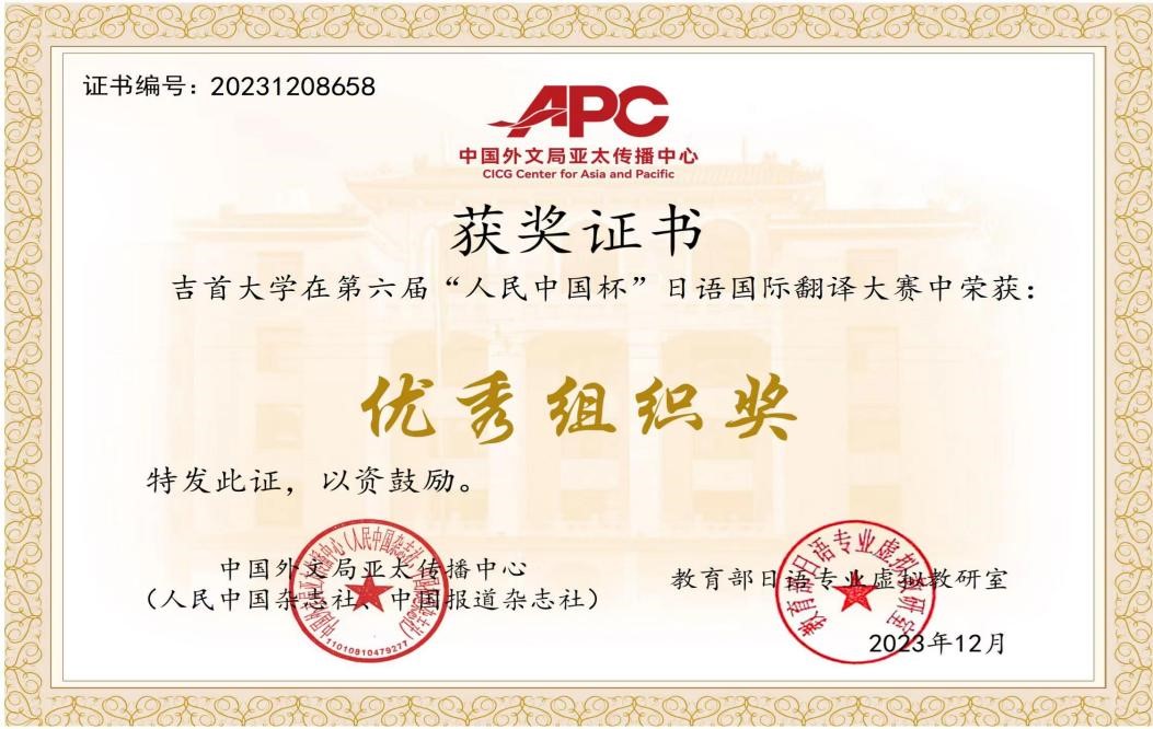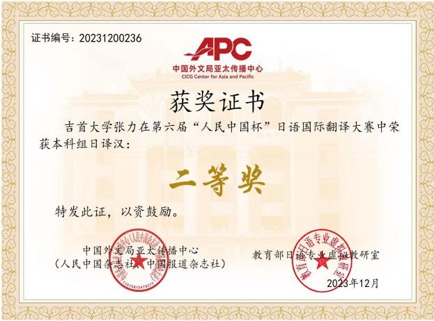 第六届人民中国杯日语国际翻译大赛自2023年3月启动,至2023年11月结束,历时8个月,主要设中学组、本科组、社会组日译中、中译日等口、笔译组别。mk体育对该赛高度重视,委派日语系博士潘贵民副教授负责此次比赛的具体组织与指导工作,其他教师在此过程中给予了大力支持与配合。在潘贵民博士认真负责的指导下,参赛员工积极努力,在吃透翻译文本的基础上对译稿进行反复推敲、润色。最终,2020级周怀宇同学获得本科组日译汉一等奖、2020级刘帅宇、2021级张力同学获得二等奖、2021级谢妍、2020级牛悦同学获得三等奖。此外,2020级周怀宇同学还获得本科组汉译日三等奖。本次比赛中公司选手展现出良好的专业素养和能力,为公司日语人才培养赢得了良好声誉,扩大了公司的影响。