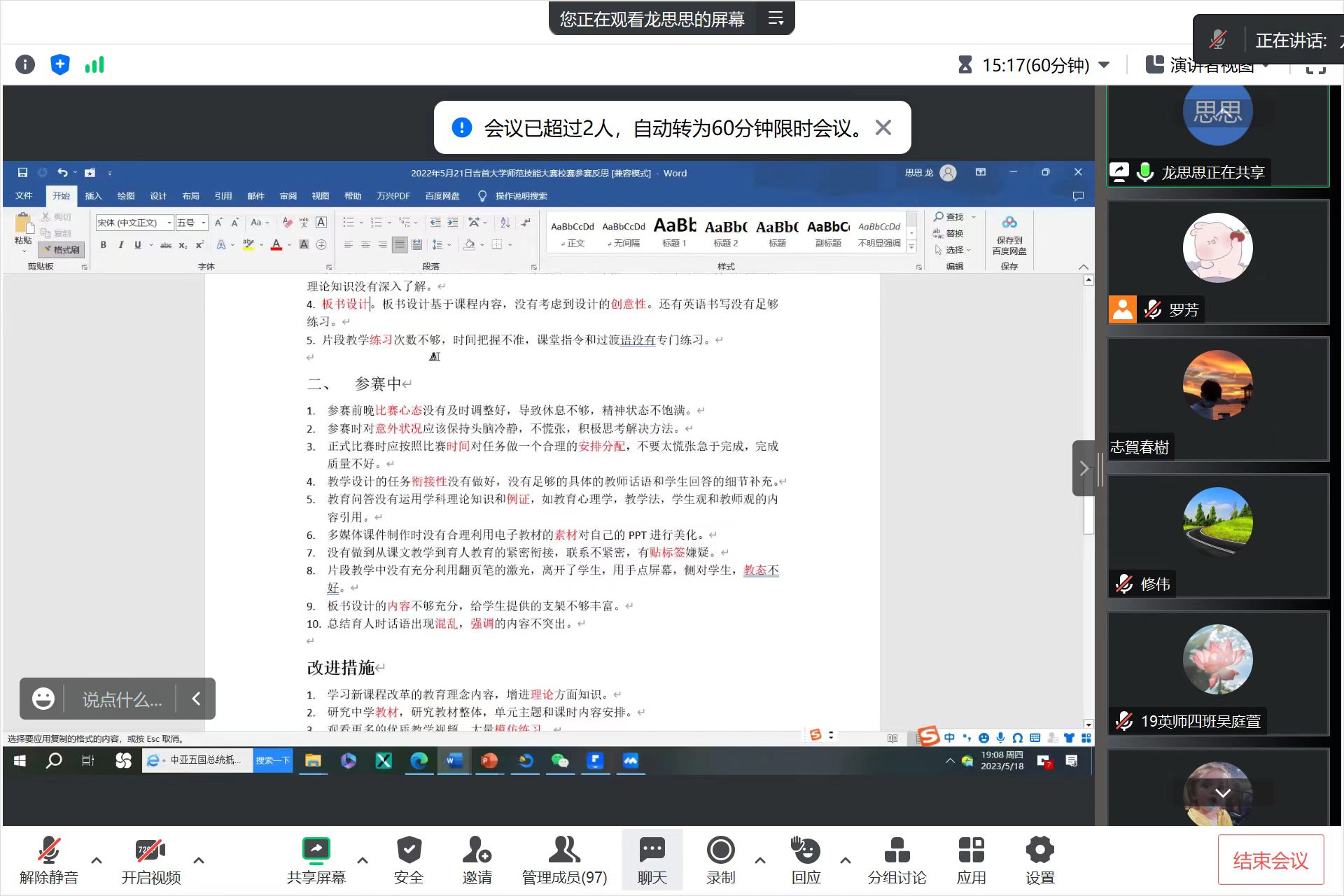 2019级龙思思同学结合自身参加各级师范生教学技能竞赛的经历,分享其备赛点滴、参赛流程、参赛注意事项、参赛后的反思与感悟等;她总结了参加学科竞赛对自身成长的意义,汇报了作为职前英语教师在竞赛中磨练自身的教学技能,提升自己的专业实力的感悟,并鼓励学弟学妹们在学科竞赛中成长进步。